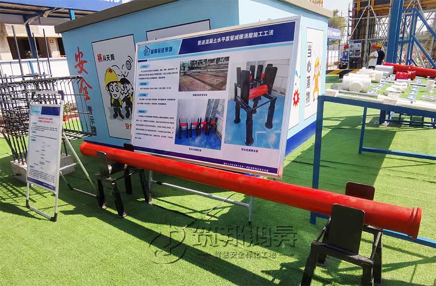 在觀摩會現(xiàn)場,還有一個(gè)紅色圓柱外形的東西吸引了眾多觀摩人員的注意。湖南教建集團(tuán)有限公司國欣向榮廣場項(xiàng)目項(xiàng)目總指揮長李海平介紹,這是其公司自創(chuàng)的泵送混凝土水平泵管減振消磨施工工法。該工法運(yùn)用的關(guān)鍵在于利用鋼筋、鋼板、滾筒、軸承等制作一種減振支架作為混凝土輸送水平泵管的支座,以減少在混凝土泵送過程中泵管振動(dòng)對已綁扎好的鋼筋骨架、模板的影響。